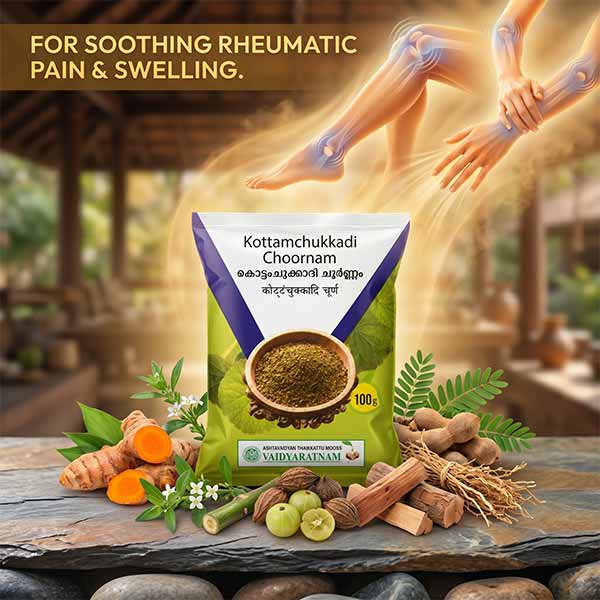 1. What is the primary use of Kottamchukkadi Choornam? It is primarily used as an external application to reduce swelling and relieve pain associated with rheumatic conditions, arthritis, and localized inflammation.